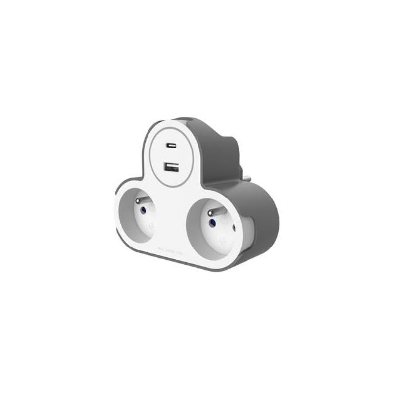 Adaptateur 2 Prises avec ports USB Type A et Type C pour charger tous vos appareils. Puissance USB totale de 17 W (5 V max. 3,4 A). Prises 16 A avec obturateurs de protection. Idéal pour un usage domestique ou au bureau.